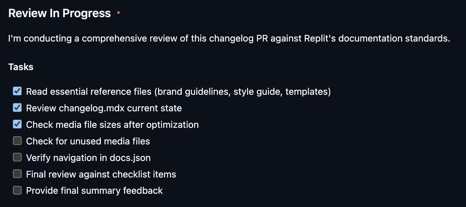 At Replit, changelogs are ~90% automated. We draft them from internal updates with an AI workflow. The agent has access to our brand voice, docs guidelines, MCP servers, and repo config.