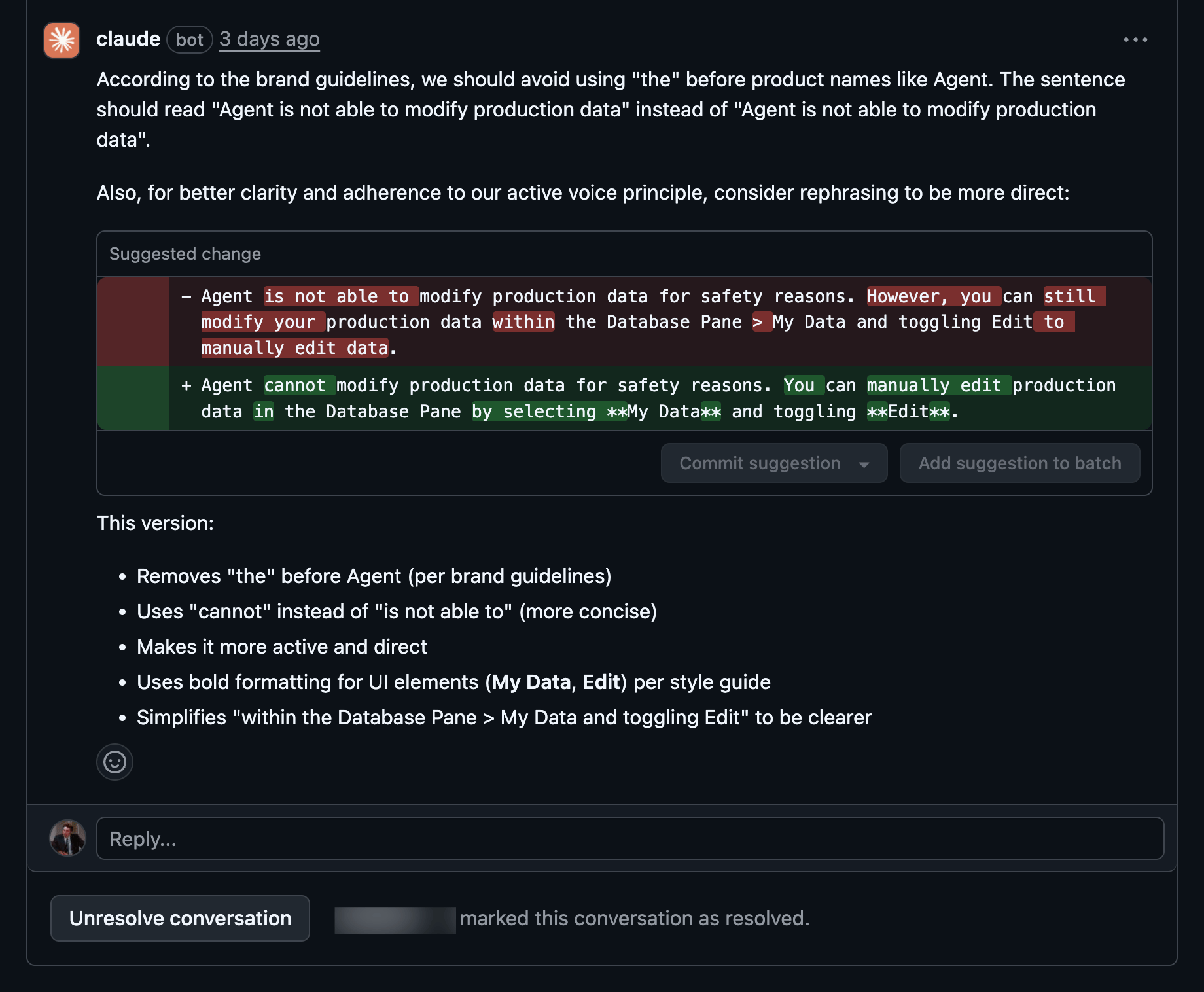 With Mintlify's preview deploys, we can implement the suggested changes and see them live in minutes.